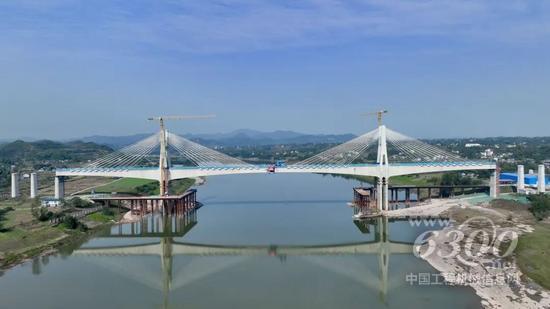 难题面前,项目团队以技术创新破局。通过全面勘察地质与周边环境,充分利用渠江枯水期水位低的有利窗口,将原本需要水下作业的复杂双壁钢围堰,优化为锁扣钢管桩围堰结合筑岛的创新工艺,不仅彻底规避了汛期风险,而且进一步优化了工期进度。针对大桥主墩承台大体积混凝土浇筑,项目多次开展专家论证,创新采用外切基坑内承台大体积混凝土整体浇筑施工技术,一次性完成5600余方混凝土浇筑,为同类型桥梁施工提供可借鉴工艺。